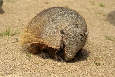 Am darauffolgenden Tag sind wir wieder staubige und holperige 75 km weit zum Punta Norte hinausgefahren. See-Löwen, See-Elefanten und Orcas (Killer-Wale) soll es dort geben und wir hatten gehofft, noch etwas näher an die Viecher heranzukommen. Falsch gehofft und Pech gehabt. Eine handvoll See-Elefanten sind herumgelegen, zum Bestaunen von ganz weit weg :-( Dafür haben wir noch einen ganz eigenartigen Kollegen getroffen - ein haariges Gürteltier.